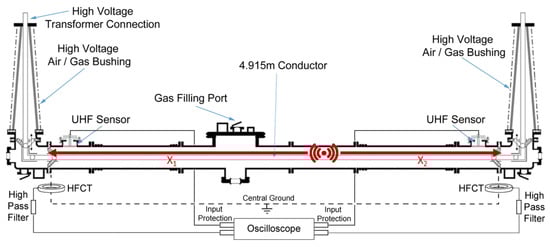 The gas insulated line demonstrator had a rated voltage of 420 kV with nominal system phase to earth voltage and normal partial discharge test voltage level, as shown in Table 1 considering the IEC/BS EN standard 62271-204 [17] and 62771-203 [18]. Partial discharge measurements taken using commercially available systems for the GIL demonstrator filled with CO2 at varying voltage levels can be found in reference [19] to experimentally show the insulation strength of alternative gases and the capabilities of traditional sensors with AC cycle analysis. The following article shows novel PD measurements using non-commercial setups, sensors and analysis to determine fault locations and analyze an author-developed location script with results which do not form part of reference [19].