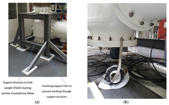 (a) Metal Support Structure with insulated pad mounted feet; (b) One of two split core HFCT partial discharge sensors installed on a single earth strap connection.