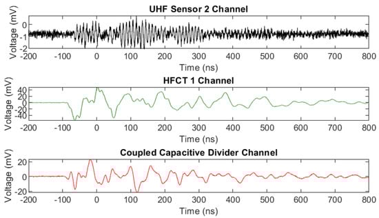 In Figure 8, measured signals from one single PD event are shown for the GIL demonstrator when it was filled with 3 bar CO2 with contaminated particles. The recorded results show that all of the sensors including the internal UHF sensors similar to those in [28,29], the external HFCTs and the capacitively coupled PD measurement through a divider’s HV capacitors all confirm the same event and their own respective outputs are shown depending on their frequency range and sensor output in voltage. Many similar events were recorded for both carbon dioxide and technical air; however, it was not possible to obtain PD measurements for pure nitrogen due to the proximity of PD inception to the breakdown voltage which occurred across the clean gas gap, making it very difficult to obtain multiple stable PD event measurements.