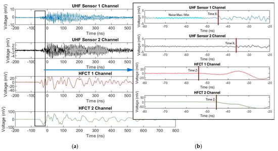 Recorded UHF and HFCT PD signals for a CO2 contaminated system at a pressure of 3 bar, applied voltage 85 kV (a) Full waveform; (b) Voltage rise point of each sensor.