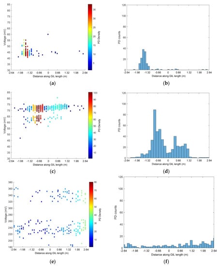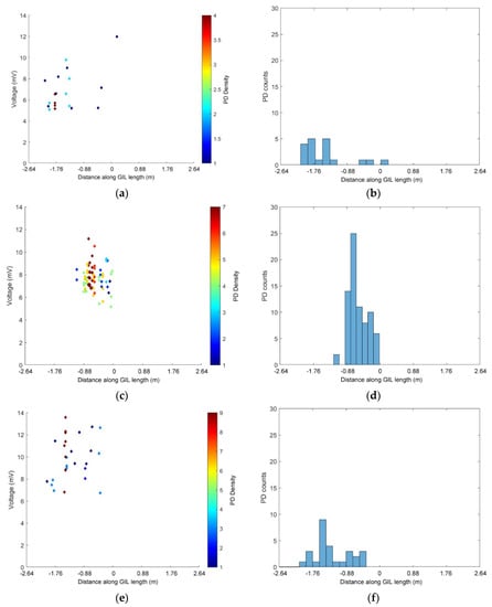 Figure 12b,d show that at 75 kV, the majority of PD events are located on the central left hand side of the GIL demonstrator, and for 85 kV, the majority of PD is located in a similar area on the left of the GIL with an added area on the right hand side which is not as active. When the voltage of conductor in the GIL demonstrator is raised to 100 kV, it appears that the contaminating metal particles are causing widespread PD along the entire central length of the conductor as shown in Figure 12f. It is possible that this indicates that the particles are much more mobile and either were bouncing on the outer enclosure along the entire length of the GIL or appear to have an aspect of freer movement in the gas along the length of the GIL. In Figure 12b,d, it is possible that the particles were only bouncing on the outer enclosure as described in [30], where a free particle may cause a discharge as charge is exchanged between the particle and the enclosure; following this, the particle falls and bounces on the enclosure and the sequence may repeat [30].
