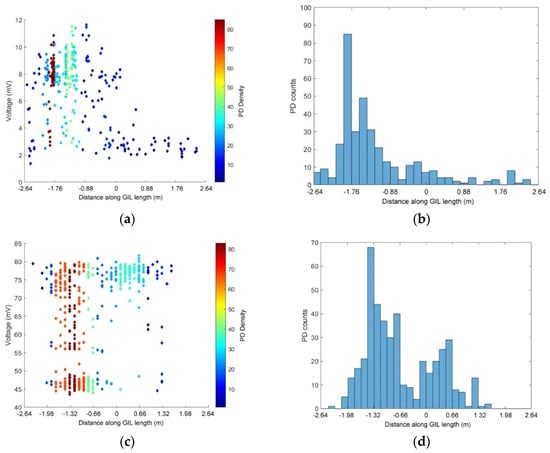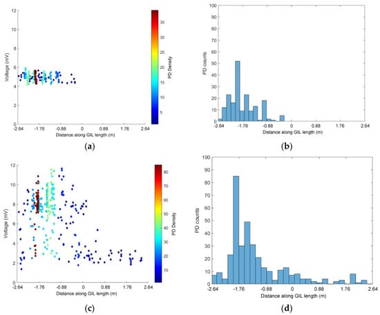 Figure 11 shows the PD activity recorded by the two internal UHF sensors placed at either end of the GIL demonstrator as shown in Figure 5, the GIL was filled with 3 bar pure CO2. The applied voltage was 150 kV on the clean system and the response of the UHF sensors is shown in Figure 11a,b. The GIL demonstrator was then tested using the same conditions, except the central enclosure was contaminated with particles and the voltage raised to 85 kV; the results of which, for the UHF sensors, are shown in Figure 11c,d. In Figure 11b,d, there is a strong clustering of PD events in the central left of the GIL demonstrator. In Figure 11a, it is interesting to note that for a clean system the grouping of PD events from the internal capacitive UHF plate sensors has a max voltage relating to the PD events which are very closely grouped, whereas in Figure 11c, for a particle contaminated system, there is a much more varied voltage response. This means that the particles are creating a very different response from the UHF sensor as they build charge moving across the CO2 insulation between the conductor and enclosure at different lengths along the GIL, which does not occur for the clean system. The moving particles also appear to have the impact that they further exacerbate the electric field stress on the left side of the GIL demonstrator shown in the clean system response; hence, the area of highest PD response is the same for both a clean and a particle contaminated system.
