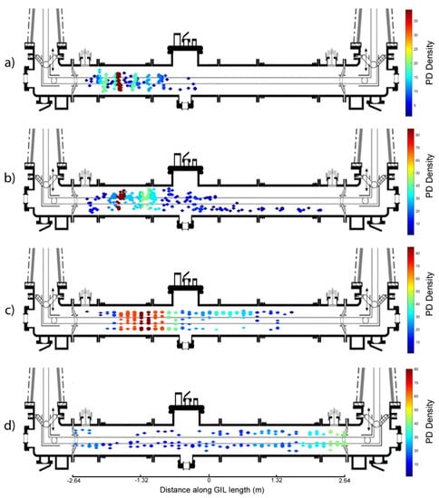 Figure 14a,b show the difference in PD location using UHF sensors in CO2 when the gas insulated line is a clean system or contaminated with particles. It can be surmised from these results that the clean system in Figure 14a appears to have a high electric field stress region on the left side where the largest area of PD is indicated as a red region; however, the amount of PD events recorded for this case was much lower than for a contaminated system. In Figure 14b, the UHF sensors are used to record PD at a much lower voltage, 85 kV compared to 150 kV in Figure 14a, but the amount of PD recorded was much higher. Figure 14b seems to show that particle contamination appears to exacerbate the electric field concentration in the region identified in the clean system in Figure 14a and also shows that there were PD events further along the whole length of the central gas insulated line. The observed PD is consistent with the expected behaviour of free metallic particles in GIL free motion, where particles bounce on the outer enclosure of a section [31] when measurements are made using UHF sensors.