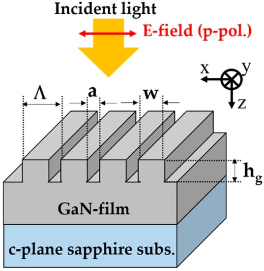 In this section, we described the basic rule of RI sensing technique with HCG. Figure 1 illustrates the schematic of the monolithic GaN-HCG geometry. The GaN-HCG with the shorter period than the incident wavelength λ is monolithically arranged on the top of the GaN-film on c-plane sapphire substrate. The incident plane wave is irradiated normally to the HCG. The electric field of the incident light is p-polarized (red arrow direction in Figure 1). The grating period, grating-bar width, grating thickness, and air-gap width are represented as symbol Λ, w, hg, and a, respectively.