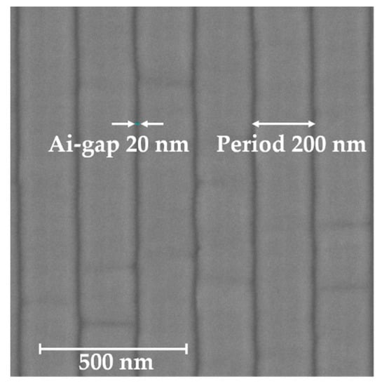 A GaN-film was grown on the c-plane sapphire substrate by using MOCVD technique. According to the reflection spectrum of thin-film interference, the thickness of the grown GaN-film is about 6 μm. The pattern of the designed HCG was developed via lithography technique with EB. The HCG fabrication process flow is as follows. The surface of the GaN sample was coated with about 100 nm thickness EB resist-film (ZEP520A: Zeon Co., Tokyo, Japan) using spin-coating method. The spin conditions of 500 and 3000 rpm were employed for 5 s and 90 s, respectively. After coating, the sample was baked at 120 °C for 30 min. The EB with acceleration voltage of 50 kV was irradiated in the vacuum chamber with 2 × 10−5 Pa in order to draw the HCG pattern. The developer (ZED-N50: Zeon Co., Tokyo, Japan) was used to form the EB resist grating pattern. Next, a 50 nm Ni metal mask for ICP etching was evaporated onto the patterned sample with 2.6 × 10−4 Pa pressure, and the patterned resist-film was removed. We transcribed the Ni mask pattern onto the GaN-film using ICP etching technique. The sample was etched by SiCl4 plasma gas with ICP power of 100 W and 50 V bias for 35 min. The SiCl4 flow rate and the pressure during etching process were 4 sccm and 0.5 Pa, respectively. Finally, we removed the Ni mask by dilute nitric acid. The scanning electron microscope (SEM) image of the fabricated GaN-HCG is shown in Figure 3. The scale bar in Figure 3 corresponds to 500 nm. The grating period and the air-gap are 200 nm and 20 nm, respectively.