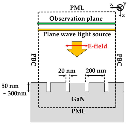 The diagram of the calculation model is shown in Figure 5. The components in the calculation model has infinite length for y-direction because the length of the fabricated structure is 300 μm, which is much larger than the incident wavelength. The calculation region of x-z plane is illustrated by dashed square. The size of the calculation area for x- and z-direction were 800 and 1710 nm, respectively. The periodic boundary condition (PBC), where the fields in the calculation region were infinitely repeating, was used as both x-direction calculation boundaries. The semi-infinite thickness GaN-film under HCG were assumed to remove the effect of GaN thin-film interference for understanding of the light behavior in the HCG. Thus, the perfect matched layer (PML) boundary condition, which perfectly absorbs the light outside the boundary, was used for z-directions. The yellow square indicates light source, and the incident plane wave was normally irradiated to the GaN-HCG. Only Poynting vector of the reflected light by the HCG was evaluated at observation plane placed above the light source. The spatial grid size and time interval in the calculation were 2 × 2 nm2 and 4.67 × 10−18 s, respectively. The detail for the calculation method are represented in our previous paper [45]. The GaN-HCG with Λ = 200 nm, w = 180 nm, and hg = 50 to 300 nm was monolithically arranged on the GaN-film.