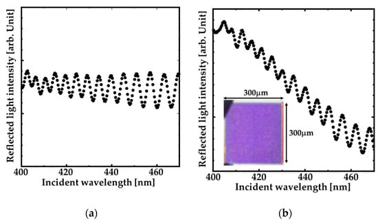 Figure 6a,b show the experimental reflection spectrum of the GaN-film and the fabricated GaN-HCG surrounded by pure water under p-polarized light illumination. The reflected intensities were evaluated by that of Al reference mirror. The nano structures in these reflection spectra were originated from the thin-film interference of GaN-film. As shown in Figure 6a, the spectrum of the GaN-film shows no reflection peak. On the other hand, the peak around the wavelength of 405 nm was obtained at GaN-HCG reflection spectrum. The inset of Figure 6b is optical microscope image of the GaN-HCG region. The 300 μm × 300 μm region of the GaN-HCG is colored with blue–violet, and the image corresponds to the HCG reflection spectrum.
