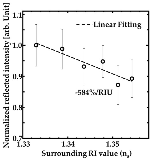 Moreover, we investigated the performance of the GaN-HCG sensor. Figure 7 indicates the dependence of the HCG reflection peak intensity on the RI value around the sample (ns). The measurements for the dependence of the intensity on ns were done in random order of ns. The open circles and ranges of the error bars mean medians and ± standard deviation ranges over 10 measurements. The intensity at the reflection peak decreased with slightly increasing ns value. The dashed line in Figure 7 is linear fitting by least-squares method, and the intensity decreasing inclination reached to 584% per refractive index unit (RIU). Assuming that 1% intensity change can be detected, the sensitivity indicates that the RI resolution of our sensor is RI of 1.71 × 10−3. These results mean our GaN-HCG sensor demonstrated detection of the slight RI change in spite of very simple surface normal irradiation system.