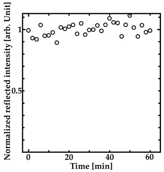 We also investigated the time stability of the reflection peak intensity. Figure 8 shows the time dependence of the reflection peak intensity of the HCG surrounded by pure water. The intensities were normalized by the average intensity value during the measurement. The intensities were measured each 2 min during 1 h. The standard deviation of the intensity fluctuation during 1 h is about ±0.05. The result means that the time stability of our sensor is enough for RI measurement because the fluctuation is smaller than the experimental error bars in Figure 7.