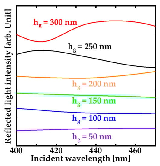 For various grating thickness hg, the normal reflection spectra of the GaN-HCG fixed to Λ = 200 and w =180 nm were calculated in Figure 9. These structural parameters of Λ and w were taken in SEM image of the fabricated HCG (Figure 3). The spectra of the GaN-HCG strongly depends on hg because hg determines the phases of the each modes in the interference, as described in Section 2. Reflection peak cannot be obtained at hg = 50 nm to 200 nm because the phase differences between the excited modes were small due to the thin grating thickness. For hg = 250 and 300 nm, we can see the peak in the spectrum at the wavelength of 415 and 450 nm, respectively. According to calculation spectra, the actual etching depth of the fabricated GaN-HCG is estimated to be about 250 nm because the calculated spectrum shows good agreement of the experimental results.