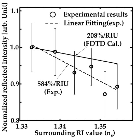 Comparing the calculation results with the experimental one, the experimental sensitivity is higher than the calculated one, as shown in Figure 10. The cause of the higher sensitivity can be attributed to the fabrication imperfectness of the actual GaN-HCG. The fabricated HCG includes the fluctuation of the structural geometry, such as rough side walls of the HCG (See SEM image in Figure 3) whereas ideal shape of the grating was assumed in the FDTD simulation. When the grating shape is not ideal rectangle and rough, the effective RI of the HCG bar is locally reduced. This causes nonuniformity of the mode’s phases, and the interference of the modes at the HCG and GaN-film interface also become more unstable for the change of ns. This consideration opens up the new design method for high sensitivity of RI sensing with HCG, and the HCG will be optimized for more high sensitivity in further work.
