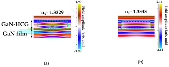 Also, the magnetic field distributions around the GaN-HCG were illustrated in Figure 11a,b. The field amplitudes were normalized by that incident light. Inside the GaN-HCG, the field profile was quite difference from that of plane wave. In the case of ns = 1.3329 (Figure 11a), the field concentrates into grating-bar, and the field in the grating-bar is out-phase with that in the air-gap at the bottom boundary between HCG and GaN-film. This fact corresponds that the input light was resonantly reflected at the HCG bottom boundary, and the peak can be resonantly obtained in the reflection spectrum [40,41,42]. When the RI value ns varied to 1.3543 (Figure 11b), the field evenly distributed at the bar and air-gap. The phase relation between the bar and air-gap is in-phase, and the interference between modes is also significantly influenced. This can be explained as follows. The increasing of ns has influence on the phase and amplitude of all excited modes. The effect of increasing ns in each modes accumulated to the interference. Thus, the significant intensity change of the reflection peak can be obtained for the slight increasing ns.