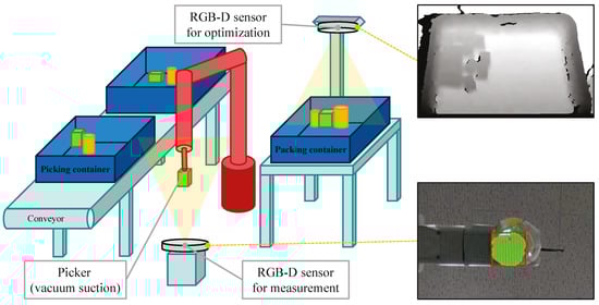 In online 3D BPP, object information can be obtained after the picker delivers the object. For simplicity, it is assumed that a well-implemented object-picking system is virtually implemented. As the picking mechanism, one-point vacuum suction is assumed. RGB-D sensors are effective for quickly and inexpensively measuring the dimensions and orientation of an object, as demonstrated by previous studies [22,23,24]. In this section, we first describe the configuration of the picker and an RGB-D sensor. In addition, the procedure for obtaining the dimensions and orientation of an object from sensor data is explained.
