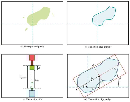 As shown in Figure 3c,d can be calculated by subtracting from . is the average of the z-axis values of the point clouds in the object area. And then, a rotated rectangle of the minimum area enclosing the object area is obtained. By scaling the dimensions of this rectangle from the pixel unit to real world unit, w, h, and can also be calculated.