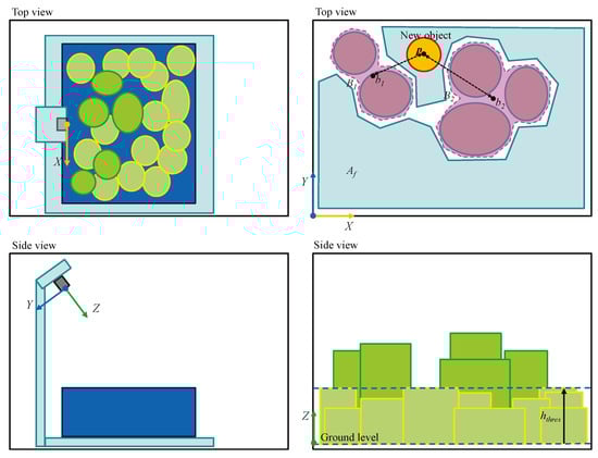 Online BPP has been also studied extensively in the literature. The previous studies successfully implemented online packing processes. Some have employed the fine-tuned heuristics based on the product packing routine [16,17,18] and the others have actively used deep reinforcement learning for their methods to learn how to pack things effectively themselves through trials and errors [11,19,20,21]. However, due to the high computational load of online optimization or learning complexity, objects have been assumed to be boxes without rotations or 3D problem has been decomposed into multiple 2D problems by packing objects layer by layer. Also, the container has not been monitored since the packing process has been assumed to be ideal. In this paper, considering these issues, each object dimension (including orientation) as well as the corresponding available packing area of a container is measured in real time as a preliminary step of online object position optimization. In addition, the optimization problem has been simplified using the optimization criteria inspired by the way people load things.