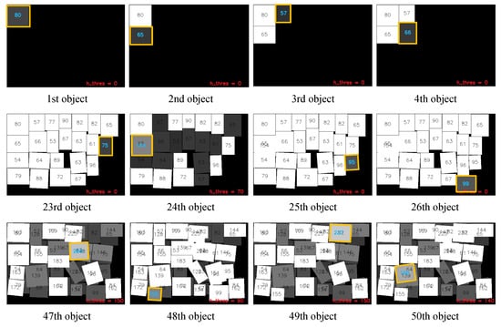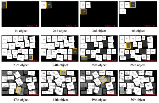 Figure 5 shows the snap shots of the object-packing simulation without manipulation error. The corresponding object boundary margin was set as 1 mm. As shown in the figure, the rotation of the objects can be taken into account. The most important thing is that the proposed packing algorithm can make full use of multiple layers instead of the layer by layer strategies of the previous studies. The 24th object was placed on the second layer because the object was relatively large and the feasible area on the first layer was tight. Then, the 25th and 26th objects were placed on the remaining area of the first layer. Similar phenomena can be seen through the 47th–50th objects. As a result, the proposed method successfully performed online object-packing using a novel optimization process mimicking human behavior.