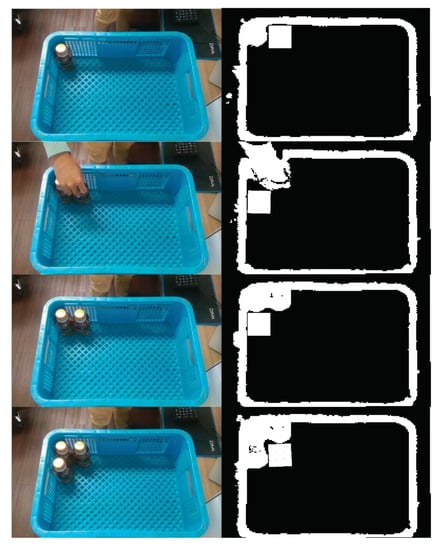 Finally, the actual object-packing process using a standard container and the products used in actual logistic is demonstrated in Figure 7. Left column shows the RGB images and the Right column shows the generated depth maps. The white square represents the placement position of the next object which is calculated through the proposed optimization method. Instead of a manipulator, the objects were moved by hand to the desired position. As shown in the figure, the proposed method successfully calculated the optimized placement position with respect to serial inputs.