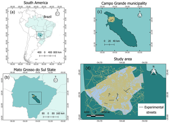 Study area in (a) South America and Brazil, (b) Mato Grosso do Sul, (c) Campo Grande, and (d) experimental streets. The black lines represent the streets used in the experiments
