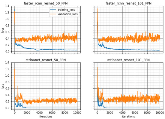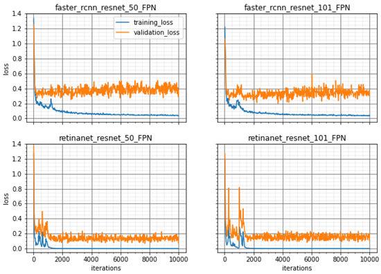 The training of the methods was performed with different backbones and the loss curves are shown in Figure 3 and Figure 4 for both groups, 76-12-12 and 66-12-19, respectively. These loss curves indicate that no overfitting occurred because the loss values for training and validation were similar and did not increase. Furthermore, the RetinaNet model converged at approximately 2000 iterations while the Faster R-CNN needed about 8000 iterations until the training loss curve remained flat. This was noted for both proposed divisions of training, validation, and testing sets.