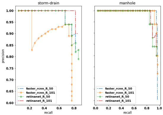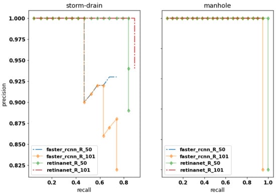 The average precision (AP, %) and its mean values (mAP, %) obtained from the area under the curve are illustrated in Figure 5 and Figure 6 and in Table 2. The results on Table 2 display the IoU cutoff at 0.5 (AP50) and the AP values to each class, manhole () and storm-drain (). The best AP50 values are achieved by RetinaNet, compared to Faster R-CNN, for both datasets division (76-12-12 and 66-12-19). Furthermore, RetinaNet provides the best results for the storm-drain class, which is more challenging to identify when compared to the manhole class.