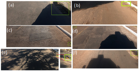 Examples of images that some models did not predict the bounding boxes to the division 76-12-12 considering (a) shadow presence, (b) small size objects, (c) small size objects truncated, (d) small size objects, (e) small size objects with shadow presence and (f) shadow presence.
