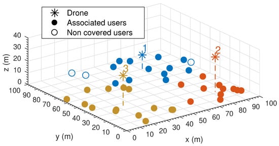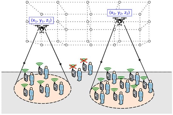 - Drones are denoted by the set . Their location is given by the set , where represents the three-dimensional coordinates of drone i.
