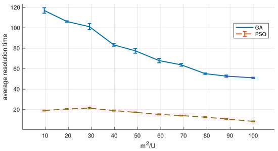 For small flying spaces, solutions could be found through exhaustive search by assessing the objective function (i.e., see (9)) for every grid edge for an increasing number of UAVs, starting with one (). If no valid solutions were found, the number of drones should be increased until a solution is found, or a maximum number of UAVs is reached (). Once a solution is found, the search method has to consider launching an extra drone to ensure that the objective function value cannot be further reduced (i.e., increasing the number of UAVs could reduce the UAV turnover rate). However, although exhaustive search is feasible in very small areas, it is not generally feasible in most real-life scenarios, for assessing a solution with D drones would require to evaluate possibilities. Thus, we suggest using heuristic search algorithms as a general method to find solutions to our optimization problem. Although several other metaheuristic methods are applicable, we opt for using Genetic Algorithms to find a sub-optimal solution due to its simplicity and proven effectiveness in similar problems [12,40,49], since the contribution of this work is not focused on the performance of the metaheuristics method.