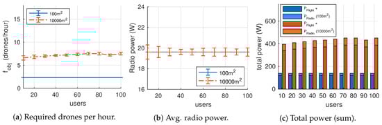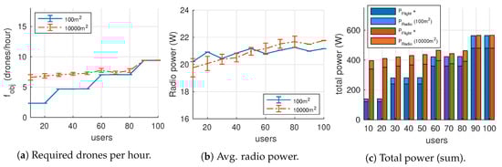 Endurance can be described as the total time taken during the flight () until the depletion of the UAV’s battery. High-power performance commercial UAVs are typically powered by LiPo batteries, whose energy density varies between 150 and 300 Wh/Kg. In this work, the UAV energy expenditure will consider two factors: flight and radio communication, being the former dominant in the energy budget.