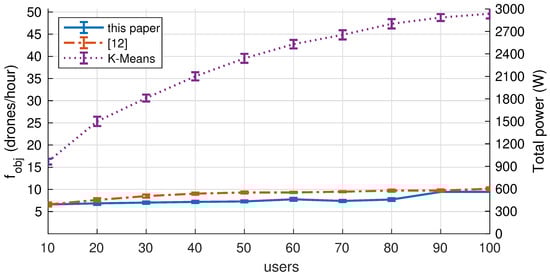 UAV’s optimal 3D placement is a challenging task that has received significant attention from the research community [3,9,17,18]. The problem has to take into account multiple factors such as the terrain, location of users, UAV-to-ground channel characteristics or radio interference between UAVs, and in our case, the Quality of Service (QoS). According to Sharkoor et at. [19], another factor to be carefully taken care of “when deploying UAVs is their flight time and energy constraints”. Indeed, the authors provide an excellent literature review with emphasis on the energy efficiency perspective, dissecting the factors affecting energy consumption in UAVs such as UAV placement, UAV-user association, flight-time, mobility, trajectory, and UAV communication and mechanical energy. Although optimal 3D placement has been extensively addressed, the comparison between works is difficult as they have different objective functions and constraints. In general, we can classify them roughly as (a) those that minimize the number of UAVs deployed [20,21,22,23] (i.e., minimize deployment cost); (b) those maximize energy efficiency or battery lifetime [24,25,26] (i.e., UAV endurance [27]). Energy-aware UAV optimal deployment problems typically considering the power consumption due to either radio communication [25,26] or mechanical energy [24] using energy consumption models [28,29]. The reader is encouraged to read the surveys [2,19,30] for a more detailed list of works and references that address the problem of 3D placement with emphasis in energy consumption.