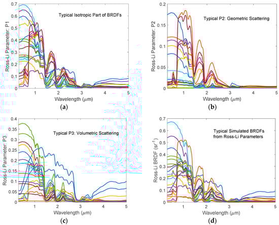 Typical Ross-Li parameters selected from 20,000 simulated samples. (a) Isotropic parts of the BRDFs; (b) Coefficients of the Li-Sparse-Reciprocal geometric scattering kernel; (c) Coefficient for the Ross-Thick volumetric scattering kernel; (d) Typical BRDF spectra of the land surfaces obtained using Ross-Li BRDF parameters.