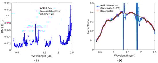 Representativeness of the simulated BRDFs validated using AVIRIS data. (a) Root mean square (RMS) error of the regenerated AVIRIS reflectances from a linearly combination of 23 PCs obtained from the simulated training data; (b) Randomly selected AVIRIS measured reflectance spectrum vs. the regenerated spectrum.