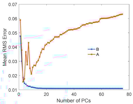 To compare the results calculated using the current HSBR model and the previous model described in references [,,], we calculated the spectral mean RMS error as a function of the PC numbers. The results are shown in Figure 4. The unstable behavior is clearly shown in the previous model and the RMS error becomes even larger with increased number of PCs, as shown in curve A in the plot. On the other hand, as presented by curve B, the mean RMS error in our HSBR model monotonically decreases with the number of PCs.