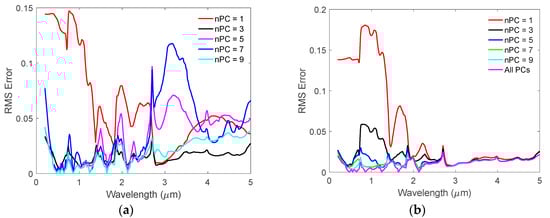 The RMS errors of the simulated BRDFs at different wavelengths relative to the original BRDFs using different numbers of PCs are shown in Figure 5. In Figure 5a, the RMS errors do not decrease monotonically with the increased PC numbers when using the method reported in [,]. This was also reported in their previous work []. On the other hand, the RMS errors obtained using our HSBR model decrease with the increase in the number of the principal components, nPC. This is what one may expect from the PCA theory. The “all-PC” result shown in Figure 5b is obtained by using Equations (18) and (19) with all PCs included. It has the smallest RMS error as expected. The change in RMS error becomes negligible when the number of PCs is larger than 20. Thus, we will only show the results in the following parts of the paper using 20 PCs.