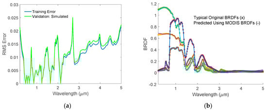 (a) Validation RMS errors for the hyperspectral BRDF spectra. Blue line is for training error while the green line represents validation error using the independent simulated BRDFs; (b) Validation results for BRDF spectra. The symbol ‘x’ indicates the original data while the symbol ‘-‘ is for the simulated results. The simulated results overlap with the original ones very well.
