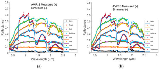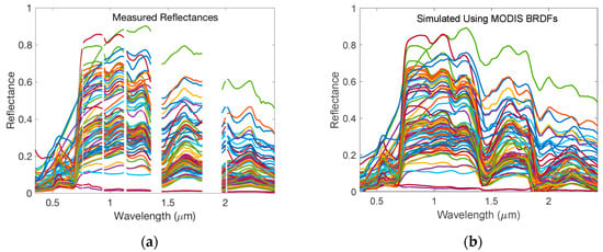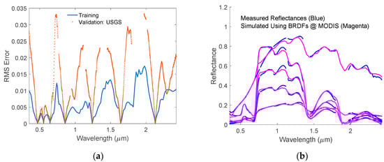 To check how well the HSBR model-generated spectra agree with the experimental measurements, we calculated the RMS errors between the original USGS reflectance spectra and those generated using the 7 MODIS surface channel reflectance values. The results are shown in Figure 9a. The RMS errors, which are smaller than 0.035, are acceptable for remote sensing applications. It is reported that the differences in the measured reflectances of the same sample using different equipment may be as large as 0.05 in some wavelength ranges []. It is also worth to note that the maxima of the RMS errors appear at wavelengths close to the edge of bad bands (due to low transmittance through the Earth’s atmosphere). Therefore, the relatively large differences in these wavelength areas between the simulated reflectances and the measured ones are probably not due to the simulation accuracy. It is more likely due to the relatively large experimental errors caused by both strong atmospheric absorptions and procedure used to extract surface reflectances from radiance data.