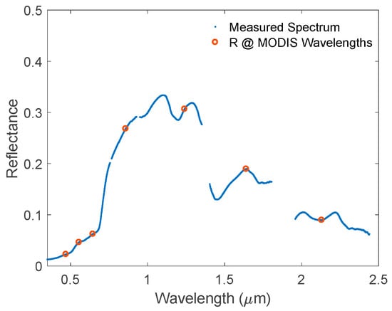 A randomly chosen experimental reflective spectrum from USGS database (blue). The red circle indicates the reflectances at the MODIS available wavelengths.