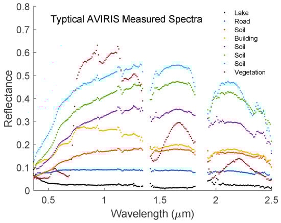 Typical measured reflectances by the AVIRIS instrument. The blank areas are wavelength ranges in which the reflectances cannot be measured accurately due to strong water absorption.