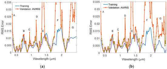 (a) Validation RMS errors of the simulated reflectances using HSBR model. The measured AVIRIS data were assumed to be the “true values”; (b) Validation RMS errors of the simulated reflectances using HSBR model with 8 hinge wavelengths. The additional hinge point is at 2.46 μm. The measured AVIRIS data were assumed to be the “true values”.