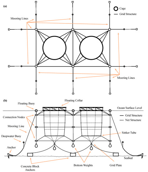 Example of a floating fish farm structure. Top (a) and front (b) views for a 2 × 1 Grid distribution.