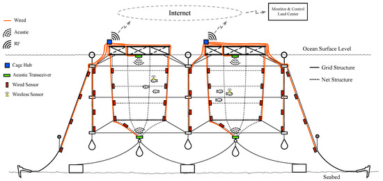Sensor networks assist the monitoring of fish farm cage as mechanic structures that are deployed in hostile open sea scenarios [8]. Particularly in Europe, offshore engineering knowledge of fish farms comes mainly from salmon aquaculture. Increasing structural safety design parameters due to the divergence of environmental scenarios [9] is the main target for Atlantic infrastructures. For instance, the structural stress analyses of the critical cases in fjords with frozen nets at cages are different from the Atlantic or Mediterranean ones due to their intricate marine current–velocity profiles. The research presented in [10] is focused on evaluating the hydrodynamic responses of an offshore fish farm to different waves scenarios. They study the forces in the mooring system using several wired arrays of capacitive gauges (load cells). The Internet connection of the cages telemetry monitoring system is the main target of the research presented in [11]. The authors introduce a Low Power Wide Area Network among offshore ocean cages which are distanced up to 2.4 km. In this case, the communications are performed in air at ocean surface level.
