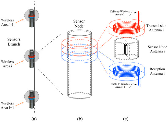 The proposed approach minimizes the wireless area in order to increase the coupling factor between antennas and the available power along the branch. The size of antenna coils is also taken into consideration in order to keep their operation in short range [22,23,24]. Moreover, the use of a cable allows for increasing the distance between sensor nodes. However, those cables add extra parasitic resistances to the circuit.