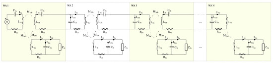 Figure 4 shows the circuital model of the sensor network branch composed of N wireless areas. The first one is labeled as WA 1. In general, all wireless areas incorporate one transmission antenna and two receiving antennas. One of the receiving antennas is used as an energy harvesting device. The other one is used to transmit energy to the next wireless area, as illustrated in Figure 3. In this schema, the first wireless area includes a reader, which is modeled by a voltage generator. Finally, the last wireless area (labeled as WA N in Figure 4) only includes one receiving antenna that corresponds to the sensor node.