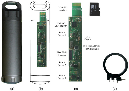 For the sensor node antenna, the HDX tranceiver used is the TMS37157. Additionally, we selected a SMD ferrite core inductor of 2.66 mH. This antenna is labeled as TDK SMD Antenna in the sensor node mainboard, see Figure 5c for details. We measured that, in the worst case, the maximum consumption of the sensor node is equivalent to a load of 15 k.