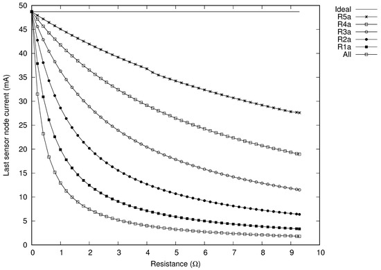 Figure 6 presents the results obtained when only one of those parasitic resistances is taken into consideration. Additionally, it included the behavior of the last sensor node when all transmission parasitic resistances are evaluated.
