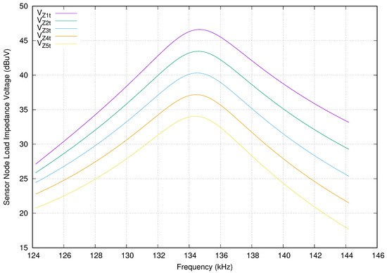 Figure 7 shows the voltage simulated in each sensor node load in terms of the frequency. The vertical axis presents the voltage in dBuV units and the horizontal axis shows the frequency in kHz. As expected, the received power is maximum at 134.2 kHz for all sensor nodes. In this case, the maximum voltage obtained is 46.46 dbuV for the first sensor node and for the second one is 43.35 dBuV, which is −3.11 dB. The deepest sensor node receives 34.03 dBuV. In comparison with the first sensor node, it is 12.43 dB smaller. Each wireless stage reduces the total received voltage −3.11 dB on average. In other words, every sensor node receives half the power than the previous one.