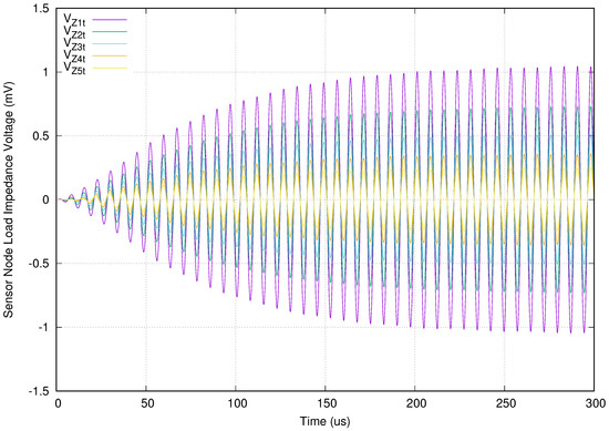 Once checked the frequency response of the proposed solution, it is mandatory to verify the transient behavior using the same setup shown in Table 2. Figure 8 presents its transient simulation. The vertical axis presents the voltage in mV at the sensor node load (). The load in this experiment setup is a 15 k resistor. Additionally, the horizontal axis depicts the simulated time, measured in microseconds.
