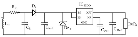 Now, we assume that all sensor nodes are working in batteryless mode. In this case, Figure 9 shows the equivalent circuit model of the batteryless sensor node. It takes into account the power management circuitry of the TMS37157. In this model, the sensor node antenna is connected in parallel to its compensation capacitor . They drive a charge capacitor using diode . The maximum voltage of this charge capacitor to is limited using the Zener diode . Subsequently, a low dropout regulator (LDO, labeled as ) to supply a nominal voltage of 2.7 V is included. In addition, capacitors and are required to stabilize LDO outputs. Finally, resistor models the microcontroller power consumption. Table 3 presents the values of the components of the sensor node model.