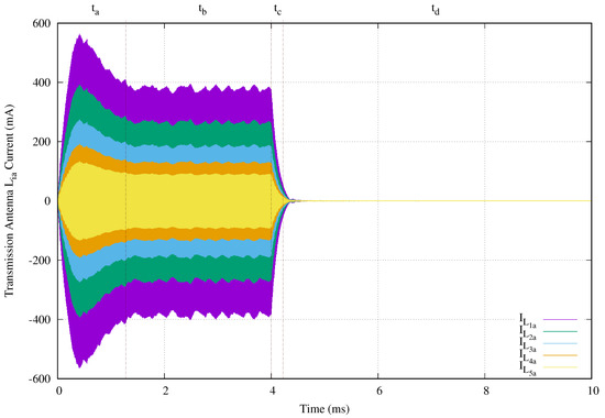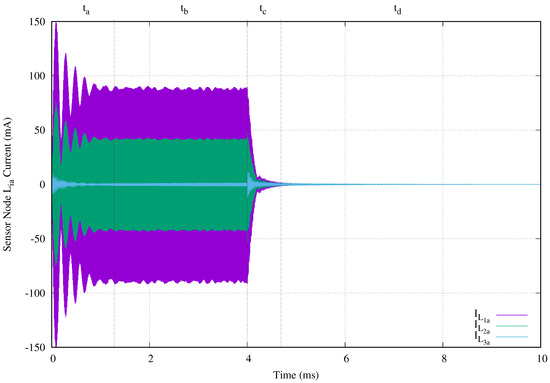 Figure 10 shows the transmission antenna currents for this experimental setup. The vertical axis gives the antenna current in milliamperes and the horizontal axis presents the time in microseconds. This behavior can be divided in four time periods, labeled as , , , and , at the top of the image. During the two periods, and , the power transmission signal is present (). And periods and correspond to the sensor node behavior when the power transmission signal is absent.