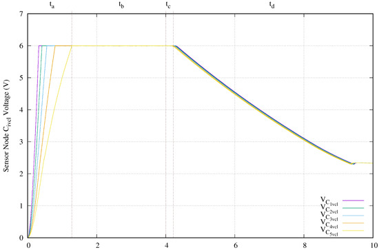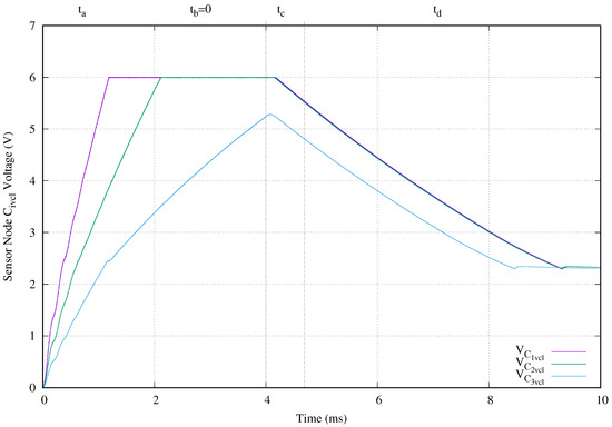 Figure 11 presents the voltage at capacitor . The vertical axis of this image shows the capacitor voltage in volts and the horizontal axis the time in milliseconds. is used basically as energy accumulator. As expected, this capacitor with a value of 330 nF is charged to 6 V first in shallowest sensor nodes than deepest ones. The first sensor node requires 324.4 ms and the last one needs 1.278 s. As appointed in the previous paragraph, as soon as the power transmission finishes and the compensation capacitors, transmit, and receive antennas lose their energy, the sensor node still working using the accumulated energy in capacitor . In this experimental setup, the is the first accumulator fully discharged. The reason for this is basically, because, during the period, the energy available in the compensation capacitors, the transmission, and receiving antennas is lower as the depth of the sensor node increases.
