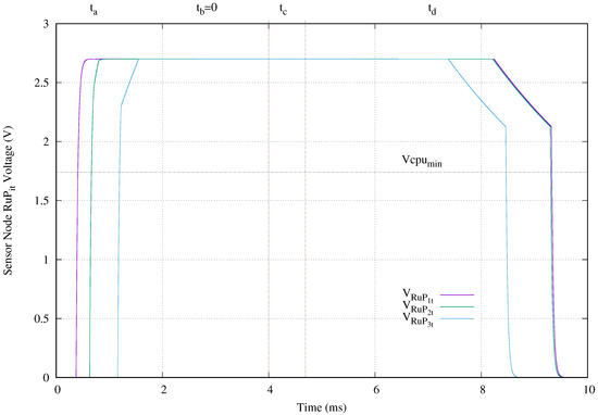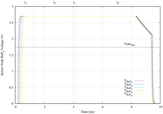 Figure 12 exhibits the voltage applied to the microcontroller modeled with resistance . Its vertical axis presents the voltage in volts and its horizontal axis gives the time in microseconds. The selected microcontroller MKL17Z256 requires a supply voltage range of [1.74,2.7] V to run in ultra low power. In this sense, the upper bound is ensured with the LDO operation at 2.7 V. The lower bound of 1.74 V is determined by the availability of energy in capacitor . Once the reaches the minimum required input voltage (2.5 V) of the LDO, it begins supplying energy to the microcontroller. The first sensor node only requires 0.22 ms and the deepest one needs 0.51 ms. Those times are lower than first period . In this scenario, the microcontroller continues running until the voltage drops to 2.5 V during discharge period . The worst case is produced in the deepest sensor node. The microcontroller is shutdown after 9.36 ms. In this experiment setup, a 4 ms power transmission tone provides an execution time of 8.85 ms, where 54.8% of this execution time is done without external power. The best running time is 9.24 ms, which correspond to the deepest sensor node.